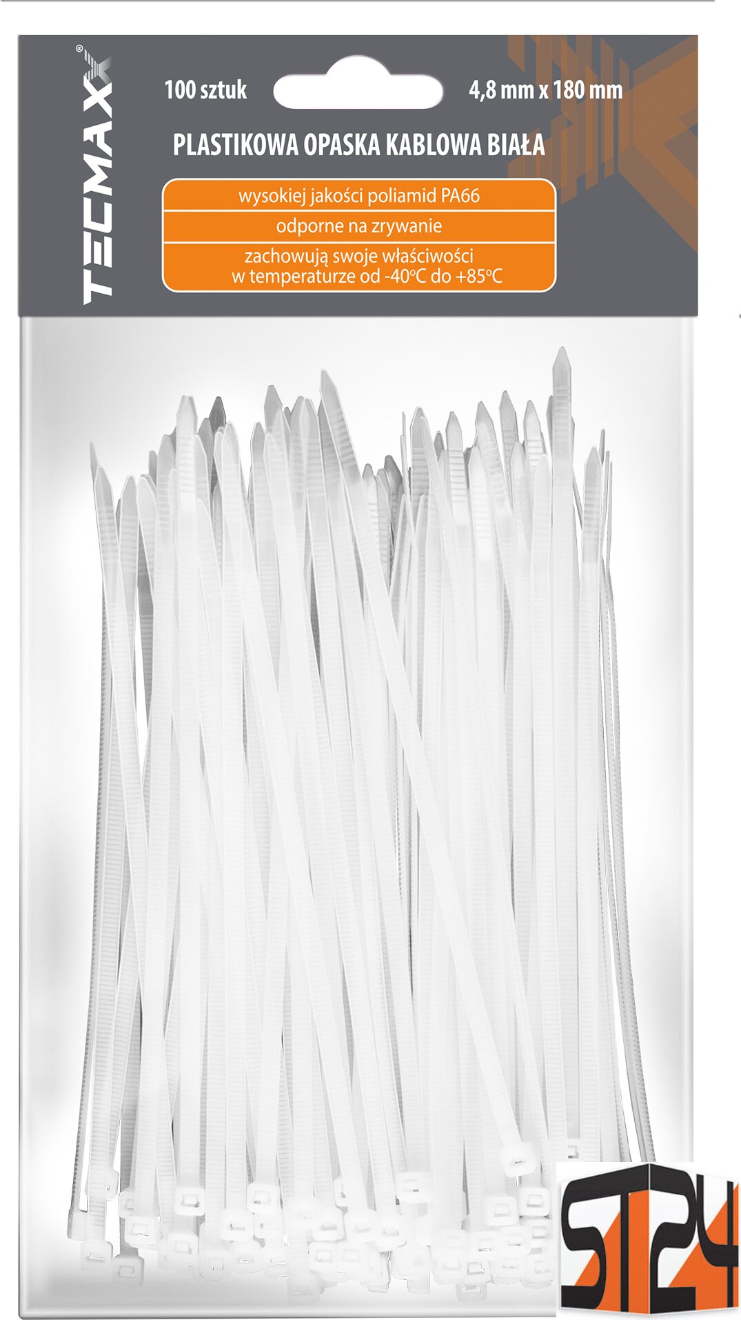 Product descriptionTECMAXX Cable Ties 4.8 mm x 180 mm, white – Reliable strength and durability for installation applications that require high strength.