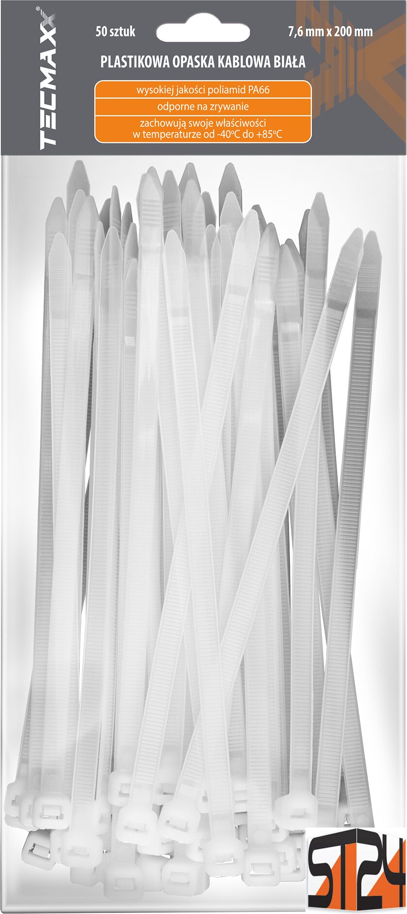 Product descriptionTECMAXX Cable Ties 7.6 mm x 200 mm, white – Maximum strength and durability for heavy-duty fastening.