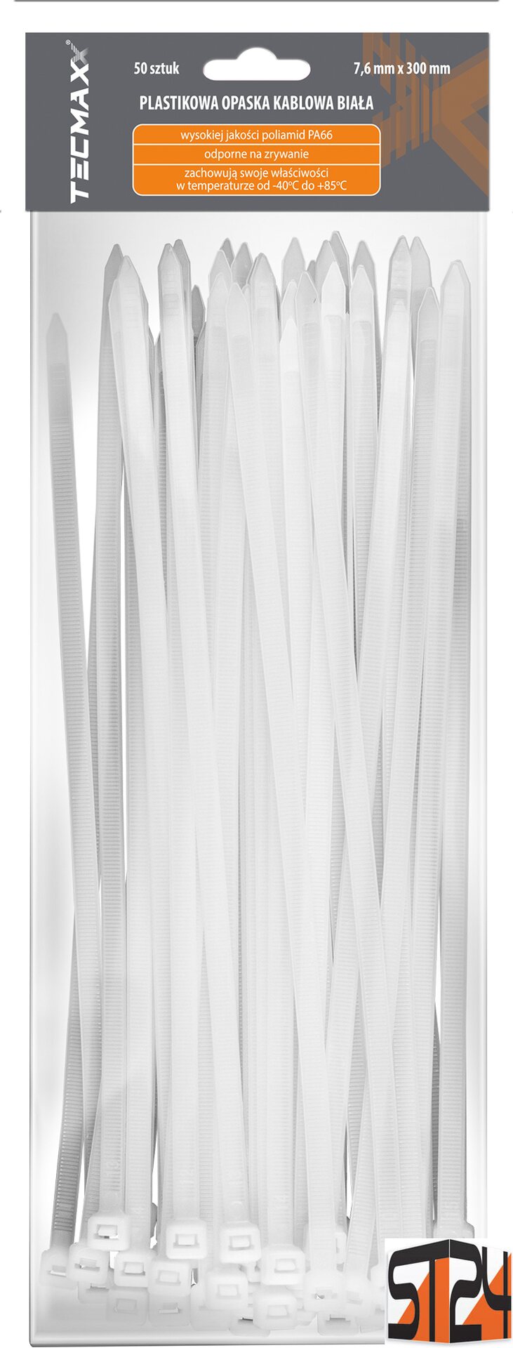 Product descriptionTECMAXX Cable Ties 7.6 mm x 300 mm, white – Maximum strength and durability for heavy-duty fastening.