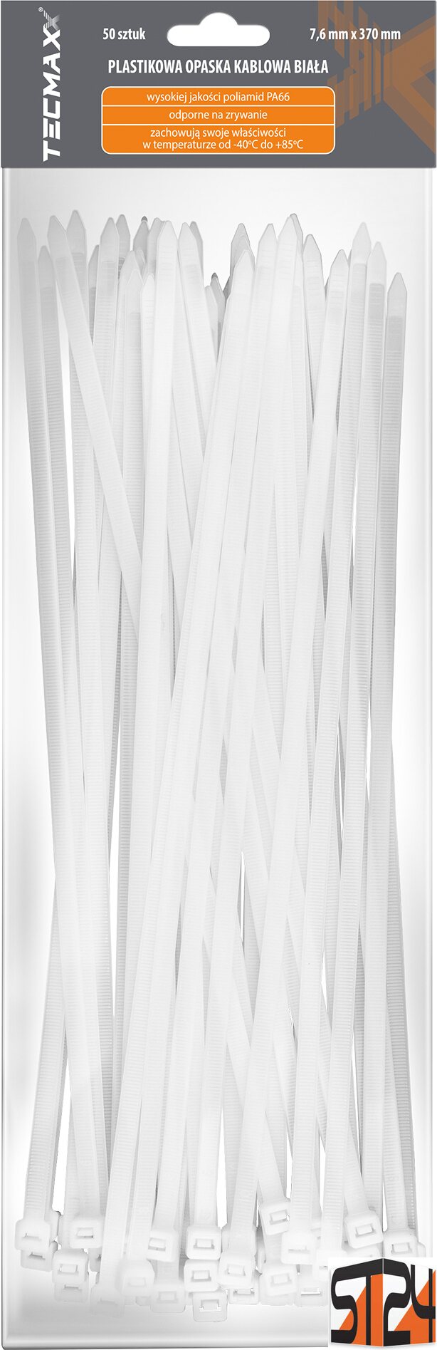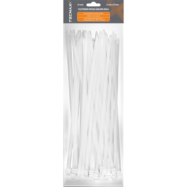 Product descriptionTECMAXX Cable Ties 7.6 mm x 370 mm, white – Maximum strength and durability for heavy-duty fastening.