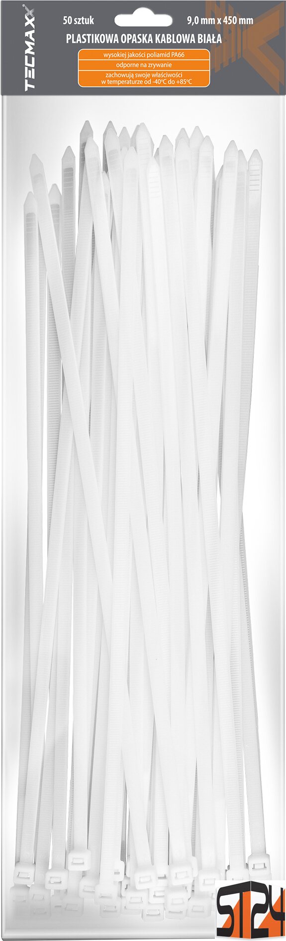 Product descriptionTECMAXX Cable Ties 9 mm x 450 mm, white – Extreme strength and reliability for the most demanding applications.