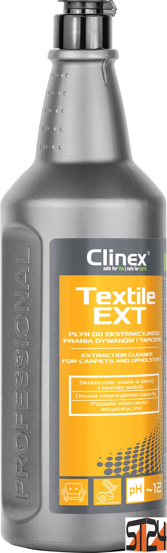 This product ensures a perfect cleaning result by removing dirt and difficult stains from the deepest layers of fabrics. CLINEX Textile EXT has excellent cleaning and degreasing properties that not only remove dirt, but also prevent its re-deposition in the future. The substance is designed to protect and refresh the colors of the fibers, restoring the original freshness of textiles. Due to its special composition, the product works effectively even in cold and hard water (Skutecznie działa w zimnej i twardej wodzie) and effectively removes unpleasant odors (Usuwa nieprzyjemne zapacy). It also has useful antistatic properties (Posiada wołączyć antystatyczne).