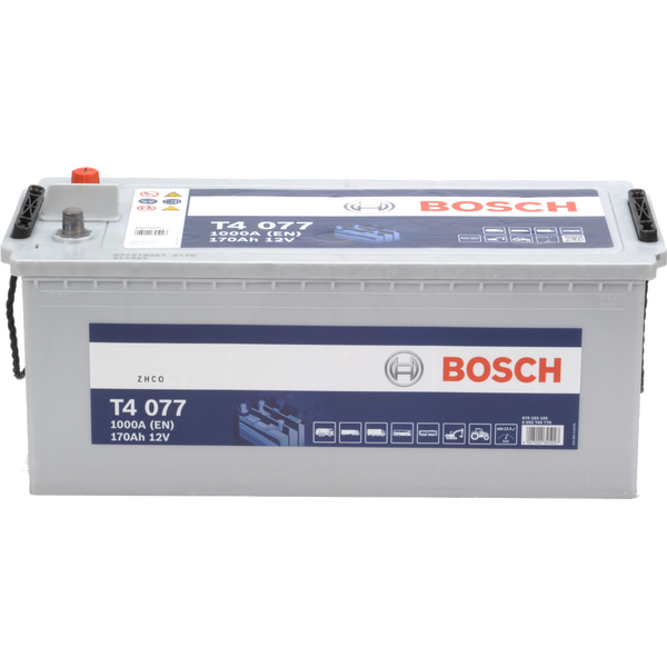 Bosch T4 077 è il modello più potente della serie T4, con una capacità di ben 225 Ah. Questa batteria è pensata per le attrezzature più pesanti, dove il fabbisogno energetico è costante e critico. È la scelta perfetta per camion a lungo raggio e macchinari edili che richiedono la massima affidabilità e una lunga durata.