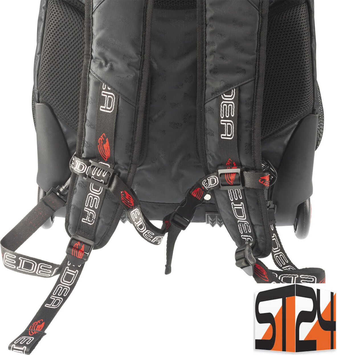 Vetolaukku, jota voidaan käyttää myös reppuna. Anatomisesti pehmustettu selkäosa airtech-verkolla ilmanvaihtoa ja mukavuutta varten sekä säädettävät pehmustetut olkaimet, joissa on kaksinkertainen säätöjärjestelmä.