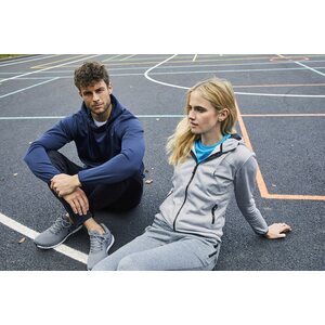 Urheilullinen tekninen huppari, jossa etutasku ja vetoketjullinen piilotasku. Hupussa on verkkovuori ja kiristysnyöri. Hihansuissa ja helmassa resorit.