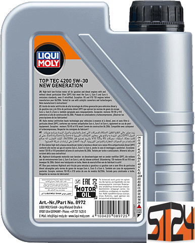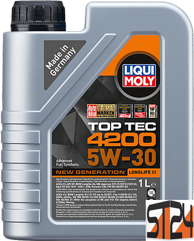TOP TEC 4200 5W-30 5 litraa Voidaan käyttää kaikkien Audin, BMW:n, Mercedeksen ja VW-ryhmän uusissa moottoritekniikoissa. Korkealaatuinen, synteettinen ja polttoainetaloudellinen moottoriöljy, 3 sukupolven longlife, varmistaa varatehon erittäin puhtaalla moottorilla. Ylittää tunnettujen ajoneuvonvalmistajien tiukimmatkin testivaatimukset. Vähentää häiritsevien saostumien muodostumista suoraruiskutusbensiinija suoraruiskutusdieselmoottoreissa (FSI, TDI, yhteispainejärjestelmä jne.). Pitää öljykulutuksen alhaisena. Turvaa hiukkassuodattimen (DPF) toimintakyvyn ja varmistaa maksimikäyttöiän. Parannetulla kulumissuojakoostumuksella. Erityisesti ajoneuvoille, joilla on hyvin pitkät öljynvaihtovälit (WIV jne.). Ympärivuotisesti bensiini- ja dieselmoottoreille mukaan luettuna FSI, Common Rail-järjestelmä sekä pumppusuutintekniikka. Sopii erittäin hyvin ajoneuvoille, joissa on hiukkassuodatin (DPF) – myös jälkivarusteluna. Turboahdin- ja katalysaattoritestattu. Luokitukset: ACEA C3 ; API SN ; BMW Longlife-04 ; MB-Freigabe 229.51 ; Porsche C30 ; VW 504 00/507 00 Liqui Moly suosittelee käytettäväksi: ACEA A3 ; ACEA A5 ; ACEA B4 ; ACEA B5 ; ACEA C2 ; API CF ; BMW Longlife-01 ; BMW Longlife-01 FE ; Fiat 9.55535-S1 ; MB 229.31 ; Peugeot Citroen (PSA) B71 2290 ; VW 500 00/501 01/502 00/505 00/505 01/503 00/503 01/506 00/506 01 (Ausnahme R5 und V10 TDI-Motoren vor 6/2006)