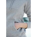 Moderni huppari, jossa etutasku ja kätevä tila kännykälle. Hupussa kiristysnyöri ja kontrastivärinen verkkovuori. 2*2 joustinneuletta hihoissa ja helmassa. Litteät saumat sävy sävyyn.